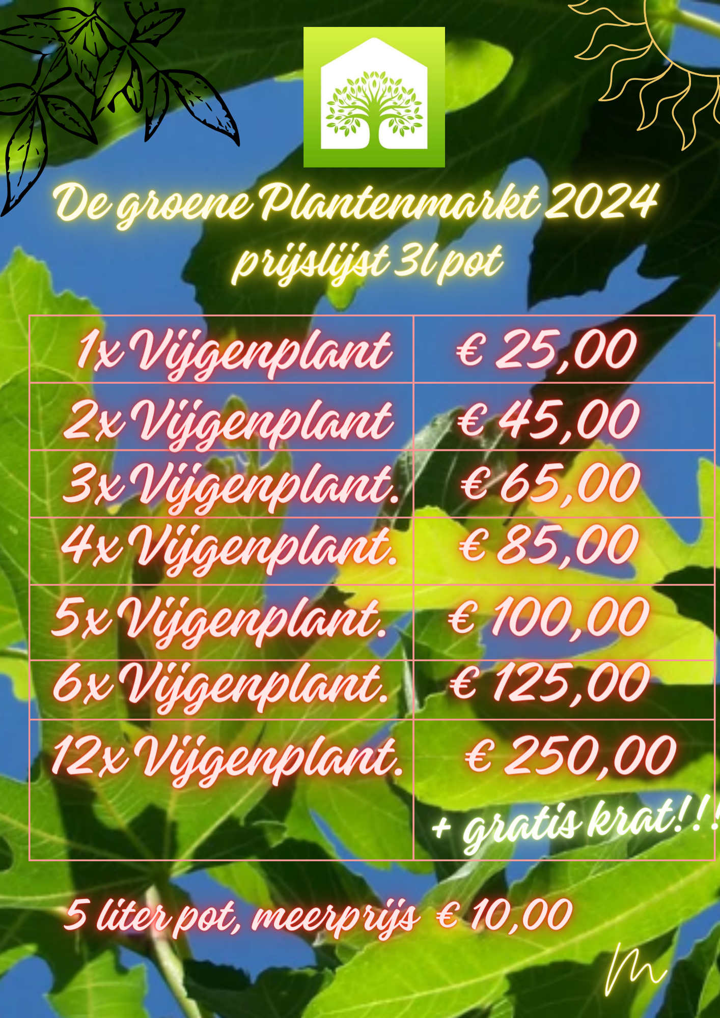 Spelregels: bestel het aantal gewenste vijgen in een 3liter pot. Wil je groter, bestel je het aantal gewenste vijgen in de 5liter variant. In het opmerkingenveld kun je doorgeven wat je graag zou ontvangen. Maar let op, zijn ze uitverkocht op de PlantenMarkt, is de levertijd wel wat langer. Hierover ontvang je dan bericht. 12 x 5 liter potten alleen afhalen. Dit is meer dan 60 kilo en de verzendkosten zijn veel te duur!